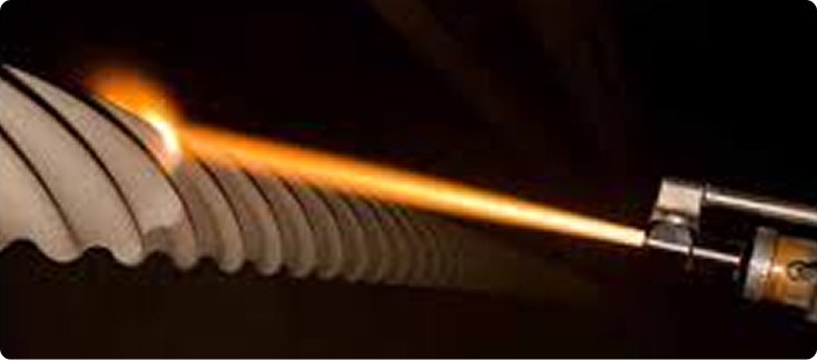 Flame Spray is a versatile thermal spray process where powder or wire feedstock is melted using an oxy-fuel flame and sprayed onto the substrate. It offers an economical solution for wear and corrosion resistance, dimensional restoration, and decorative coatings on a wide range of materials.